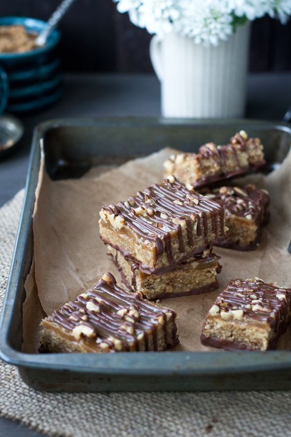 These are a more sophisticated twist on the British classics – ‘Banoffee Pie’ and ‘millionaire’s shortbread’ . I’ve combined the flavours to make these banana-walnut oatmeal bar (aka Flapjacks in the UK) topped with a salted caramel and a drizzle of milk chocolate.