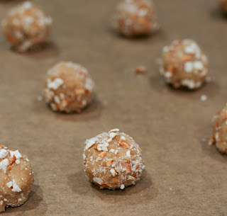Take rounded teaspoons of cookie dough and roll into balls. Roll each ballย firmlyย in the crushed pretzel mixture, then in the sugar and place on the lined cookie tray. Repeatย untilย you’ve used all the cookie dough.